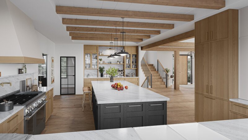Our clients came to us with a vision of incorporating an existing swimming pool and outdoor kitchen space into an entirely new home build. In order to build them a space that fit all of their needs, provided a feeling of spaciousness, and brought in lots of natural light, we added vaulted ceilings, an open floor plan, and a statement great room, perfect for gathering and entertaining with friends and family. By adding a stone exterior, creamy white wood siding, and a metal roof, we turned this Gap, PA-based home into a timeless, stylish source of inspiration and comfort for our artist clients.